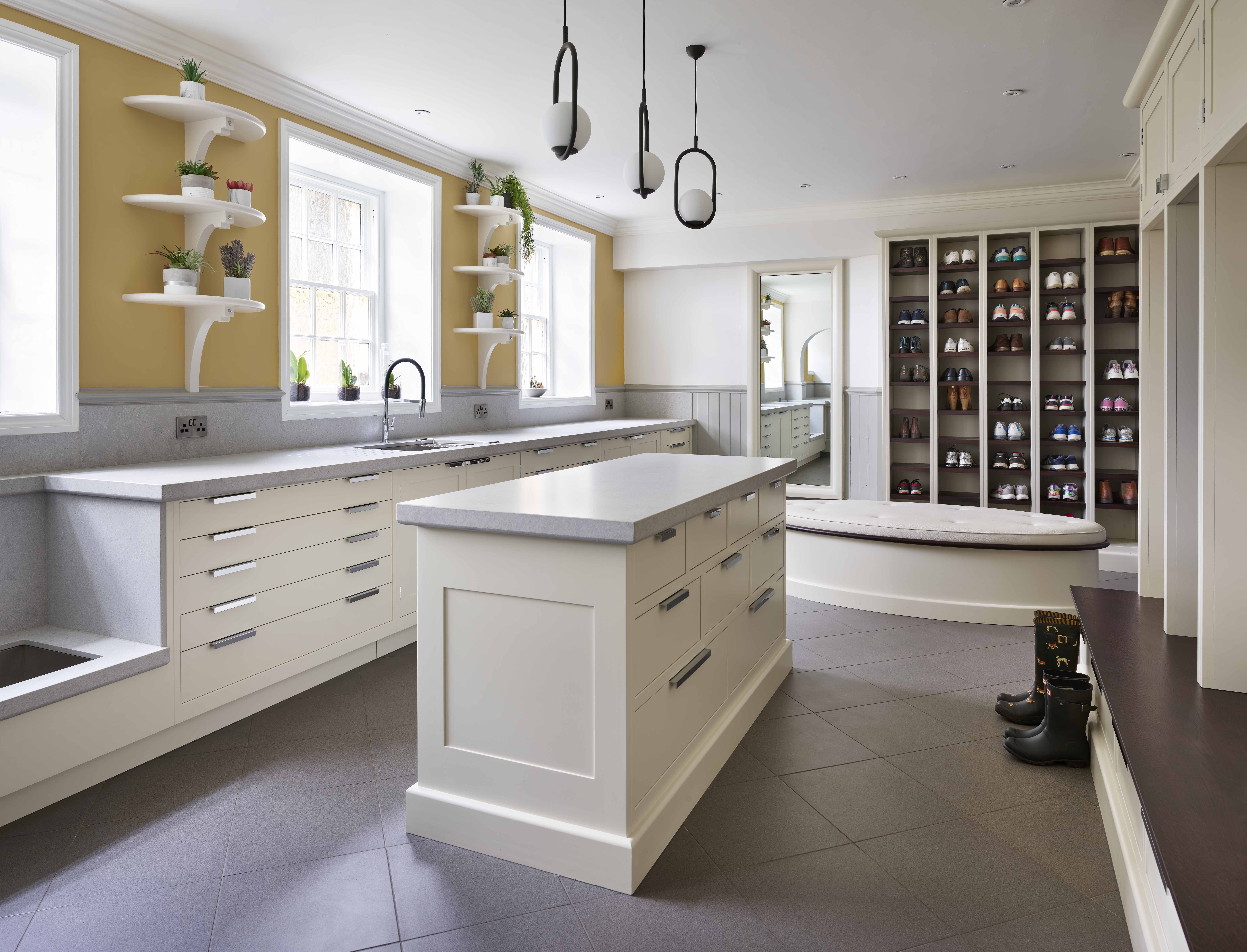 And look at this amazing boot room that covers everything: A place to change from damp coats and wellies, seating to assist pulling off soggy boots and plenty of storage, plus a low sink with shower head for dirty dogs or footwear to be washed with ease! The worktops and cladding around the low lying sink are in Konigquartz Concrete Shell with a built up 60mm edge.